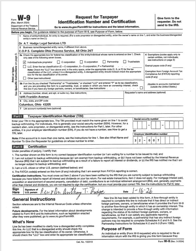 Call us for the last four digits of the E.I.N Number (W-9). We charge a process service fee for each address, with three attempts per service. No cancellations/no refunds after service orders are received, processed, or served. Four hours minimum per day for all research, investigations, and criminological analysis. Contact us to receive the best possible service for your legal needs. We specialize in process service, investigations, criminological analysis, legal research, civil filings, and skip tracing.